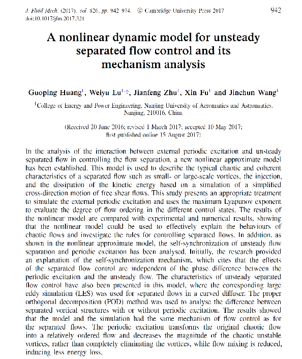 近日,我校能源与动力学院黄国平教授及其团队其他成员共同撰写的学术论文“A nonlinear dynamic model for unsteady separated flow control and its mechanism analysis”在流体力学国际顶级SCI期刊Journal of Fluid Mechanics(简称JFM, IF=2.821, 流体领域投稿期刊国际排名第一)发表。