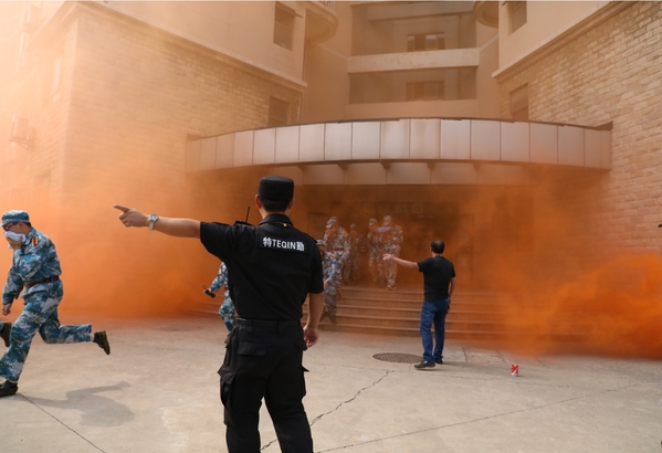 “演练开始!”随着演练总指挥一声令下,南航将军路校区高层学生公寓7楼一间宿舍浓烟滚滚,并形成敞开式燃烧,蔓延至着火层的上下层,随即公寓内响起了阵阵火灾警报声。火灾现场烟雾弥漫,宿舍管理员在接到学生报警电话并确认火情后,立即向学校保卫处和公寓服务中心领导报警,并携带消防器材,迅速组建义务消防队,引导楼内全体师生紧急疏散逃生,同时联合保卫处巡逻队员开展火灾扑救。