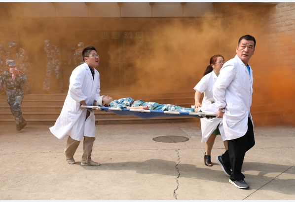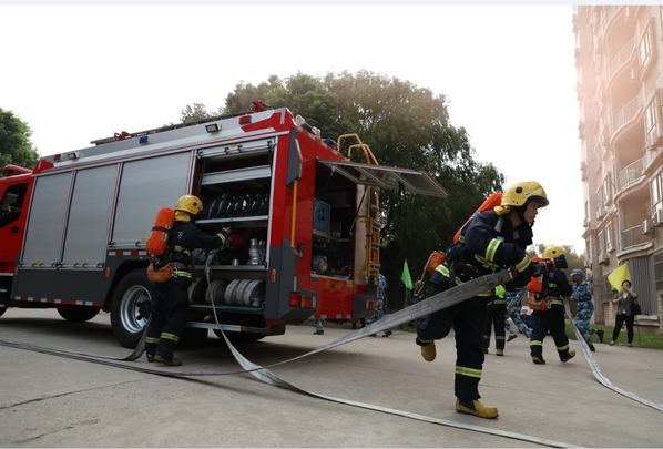 在疏散过程中,宿管人员发现某学生发生急性脚踝扭伤、头部挫伤、烟熏而引发休克,医务人员接到报警后立即赶赴现场,利用担架抬出“受伤”人员,送往医院救治;“救命啊!”此时发现七楼有人被困,一名学生正在挥舞着颜色鲜艳的衣物向外呼喊。火势太大,被困学生被逼到阳台边上,并有跳楼逃生的意图。宿管阿姨手拿扩音器进行劝解:“七楼的同学,不能往下跳,坚持住,我们马上来救你”。千钧一发之时,消防中队接警后进入校园,在校卫队员引导下到达火灾现场,迅速启动消防云梯车,全力营救被困学生,同时利用消防水罐车对大楼的“火点”实施灭火。最终,受伤人员得到及时救治,被困人员得到及时救援,火情得到及时控制,楼下观看学习的新生也情不自禁地鼓起掌来。