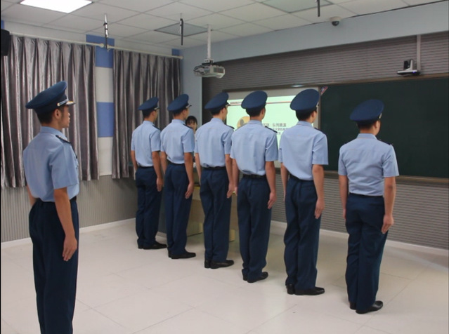 在黄颖同志的主持下,整个活动有序进行。首先全体起立齐唱国歌,现场严肃而又庄重。随后,国防生党员吕臻同志为全校师生回顾了九一八事变,之后进行了人民防空知识普及。御道街小学六年级一班的顾欣彤同学朗诵了松花江上,《中国军魂》的抗战短片唤醒了每个人内心的中国魂,紧接着的国防生队列表演更是将新一代年轻军人的精气神展示在眼前。