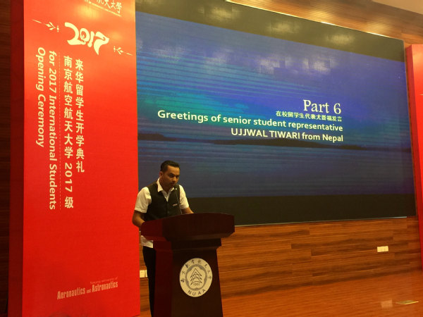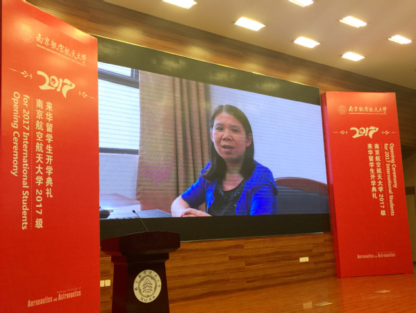 来自航空宇航学院、机电学院、经济与管理学院等6名相关教学学院的领导和教授通过视频寄语新生,鼓励新生珍惜学习机会、勤奋好学,努力学习专业知识和中国文化,做中外友谊的继承者和传递者。来自尼泊尔的在校生代表尤晋福、来自孟加拉国的新生代表伊利亚斯、来自电子信息工程学院的教师代表曹群生教授分别发言,尤晋福希望新生认真学习,广泛参加校园文体活动;伊利亚斯感谢学校的志愿者同学在开学报到时给予的帮助,并表示会好好学习,作中国和孟加拉国的友谊使者;曹群生教授代表教师对新同学表示欢迎,结合自己的经历,为新生的大学学习、成长成才提出了建议和指导。