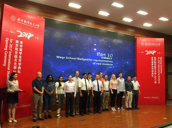 典礼由来自巴基斯坦和尼泊尔的留学生杜乐和提娃主持。开学典礼上,各位领导为留学生新生代表光荣佩戴校徽。