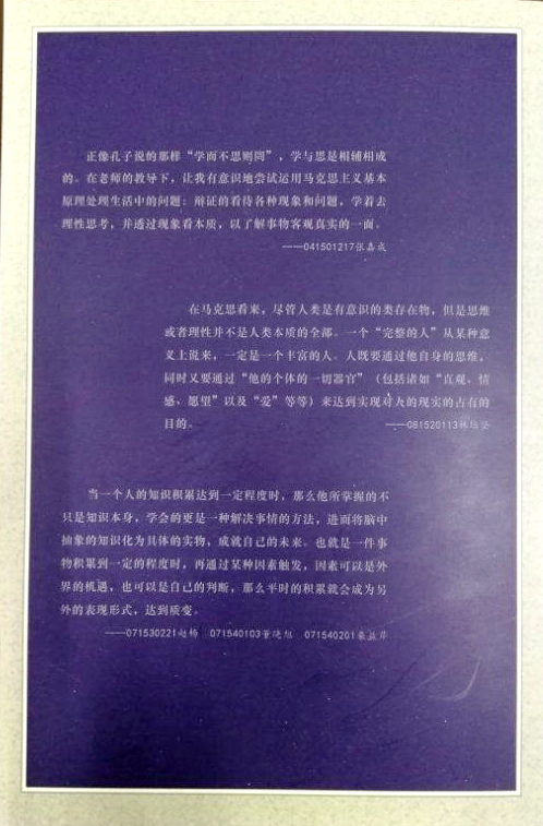 编者按:近年来,为增强思政课堂的生动性、趣味性,以及课程的吸引力、影响力,让马克思主义的理论知识和理想信仰能够入耳入脑入心,真正实现思想政治理论课立德树人的目的。我校《马克思主义基本原理概论》课程组坚持教学改革,指导学生研读经典著作、学习党的创新理论,学会用马克思主义方法去思考、分析问题,坚定理想信念。近日,课题组收集了学生思政课程的优秀论文,编印了学生论文集--《真理的追寻》,也借此向马克思致敬,向党的十九大献礼。