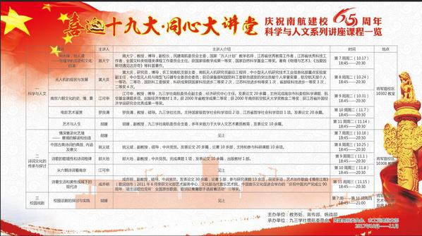 在热议十九大的同时,我校民主党派基层组织还以实际行动迎接和庆祝十九大的召开。如九三学社南航委员会、民建南航委员会、农工党南航支部共同组织的“同心大讲堂”科学与人文系列讲座拉开帷幕,讲座内容分为科学与人文、诗词文化的传承与探讨、校园戏剧三大板块,共11讲。10月17日,国家级教学名师、副校长施大宁教授所作的首个讲座“明天理、悟人道——物理学的历史和文化启迪”,受到学生的喜爱和欢迎。