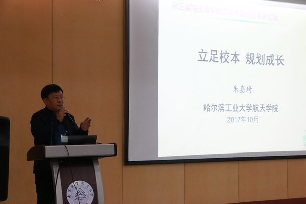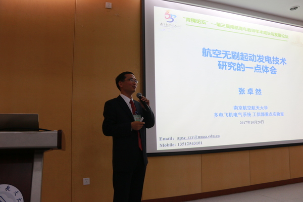在专题报告环节中,来自不同学科的四位教授分别就自己的研究内容进行了精彩的报告。中科院电工所顾国彪院士授作了题为《迎接挑战做科研》的报告,为我们生动讲述了他的科研之路,鼓励大家要敢于创新用于创新,科技强国。哈尔滨工业大学朱嘉琦教授教授作了题为《立足校本规划成长》的报告。他讲述了目前他的工作团队研究进行程度,向我们展示了他所在团队在电晶体及薄膜研究等领域所取得的专业与成果。报告过程中语言诙谐幽默,最后以一副自己所写的对联作为本次报告的结束同时为南京航空航天大学65周年校庆送上了真挚的祝福。随后南京大学刘震教授,做了《仿生分子识别及其生物医学应用-兼谈研究方向的选择与凝练》的报告,从自身学术发展历程给青年教师分享如何选择研究方向、如何做出特色的经验。最后我校张卓然教授做了《航空无刷起动发电技术研究的体会》的报告,报告就航空无刷起动发电技术等方面做了简要的概括,对航空无刷起动发电技术未来发展寄予了厚望。