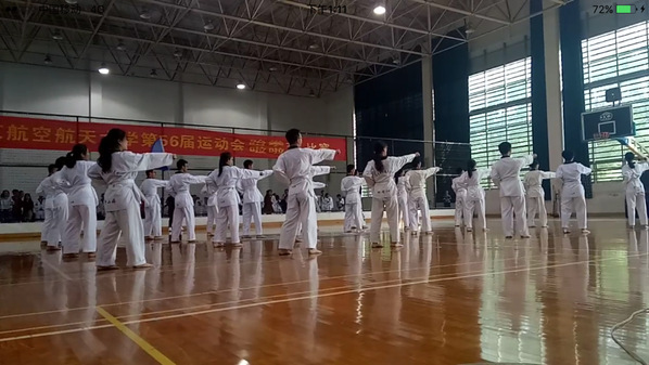 下午13点,跆拳道队员于体育中心一楼集合、进行准备,14点跆拳道比赛正式开始,航天学子高喊“寻天筑梦,问顶苍穹,航天航天,一飞冲天”的口号进场,他们精神抖擞,气势高昂,眼神坚定,动作干净利落、整齐划一,口号声响彻比赛赛馆。最终取得了跆拳道一等奖的好成绩。