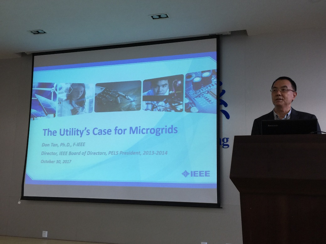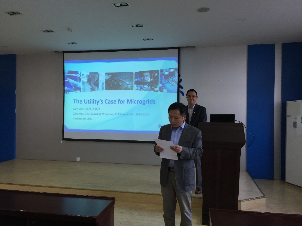 当天下午,在将军路校区电气楼学术报告厅,Tan Don博士做了题为“The Utility’s Case for Microgrids”的学术报告。会议由自动化学院副院长阮新波教授主持,电气系90多名师生参加了学术报告会。Tan Don博士首先介绍了太阳能和风能的成本平价。随后,对微电网的定义,发展所需的专门技术,部署的障碍等问题进行了探讨。接着,介绍了应用微电网的诸多优势,如可以实现变电所自动化、分级控制、频率和相位辅助调节、削峰填谷提高电力系统容量的利用率等。最后,介绍了其所在公司目前所承担的相关美国重大项目。报告结束后,Tan Don博士与参会师生针对报告内容进行了热烈讨论,并参观了多电飞机电气系统工信部重点实验室和江苏省新能源发电与电能变换重点实验室。Tan Don博士对我系在新能源发电、高效电能变换技术、微电网等方面的研究成果给予了高度评价,并希望进一步加强合作交流。