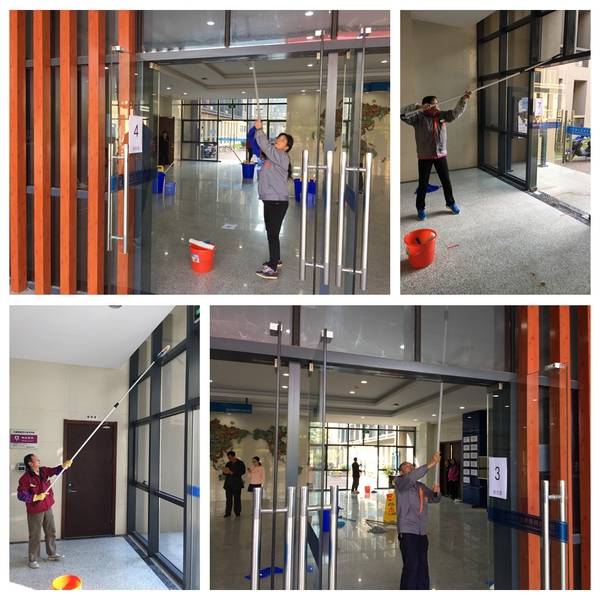 本次比赛设保洁实操、值班员知识水平测试与“物业管家”客户服务三个考核项目,不仅考察两校区物管部员工的服务技能水平,更是对工作规范掌握程度的一次实战考核。保洁比赛中,作为保洁必修课的地面保洁和玻璃刮擦是本次考核的两项内容,参赛队员赛前做了充分的准备,大家按照规定的比赛内容,依次进入指定区域,用平时驾轻就熟的工具,认真完成每一个比赛环节。在刮擦玻璃时,选手们动作娴熟流畅,挥舞着玻璃刮,贴着玻璃表面横刮、竖刮,玻璃立刻变得光洁透明、一尘不染。与此同时,值班员知识水平测试在另一个考场正安静的进行着,考试重点围绕值班员的岗位职责、校区消防安全及火灾防范等内容,既考察值班员的基本业务水平,也通过考试检验其对消防安全等知识技能的掌握程度。