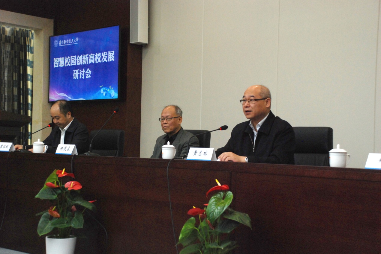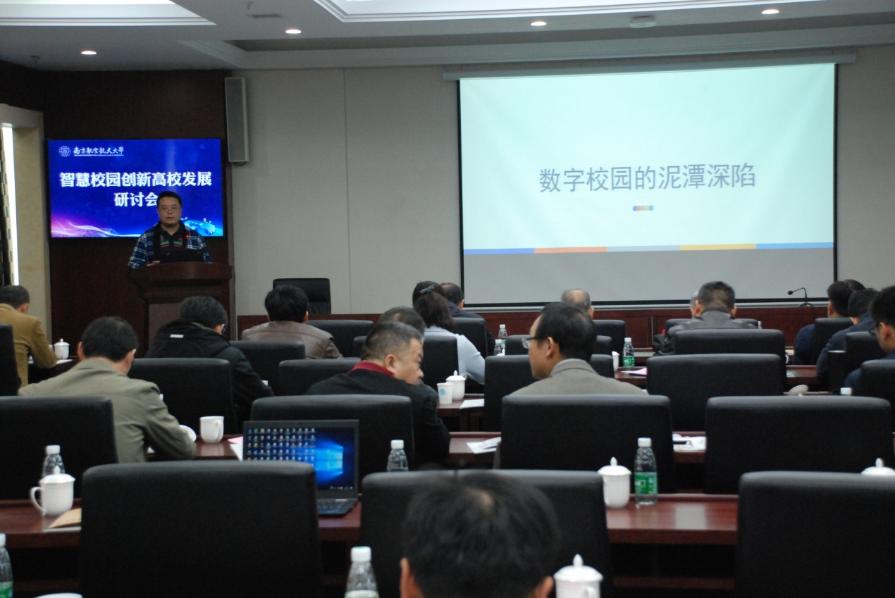 2017年11月1日上午,“智慧校园创新高校发展”研讨会在我校将军路校区1号楼5楼信息化技术中心召开。副校长黄志球教授、江苏省高等学校教育技术研究会秘书长郑铿教授、江苏省高校网络技术专业委员会理事长陈俊良教授、江苏省高校网络技术专业委员会秘书长毛明荣教授、中国教育科研和计算机网华东北地区网络中心副主任曹争以及来自工信部直属高校和江苏省高校信息化部门负责人和领域专家、信息化处(信息化技术中心)全体教职工和部分学生代表参加了会议。会议由信息化处处长袁家斌主持。