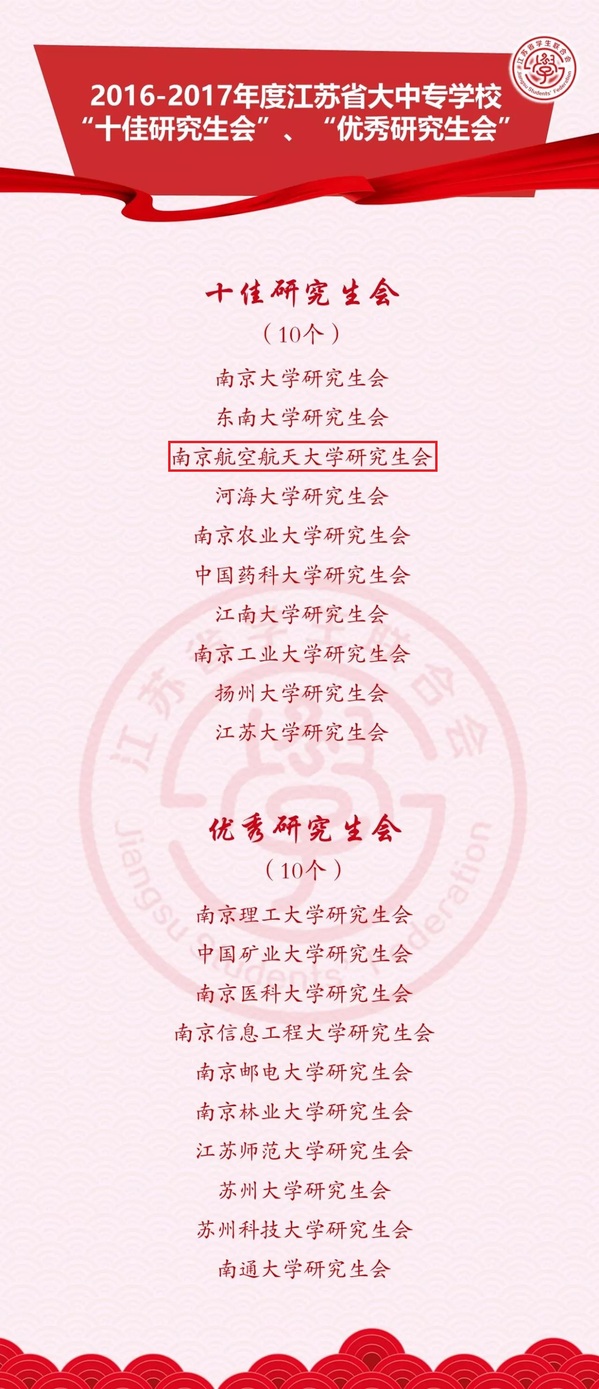 近日,共青团江苏省委、江苏省学联下发《关于表彰2016-2017年度江苏省大中专学校“十佳学生会”、“十佳研究生会的决定”》,南京航空航天大学研究生会获评“江苏省十佳研究生会”!