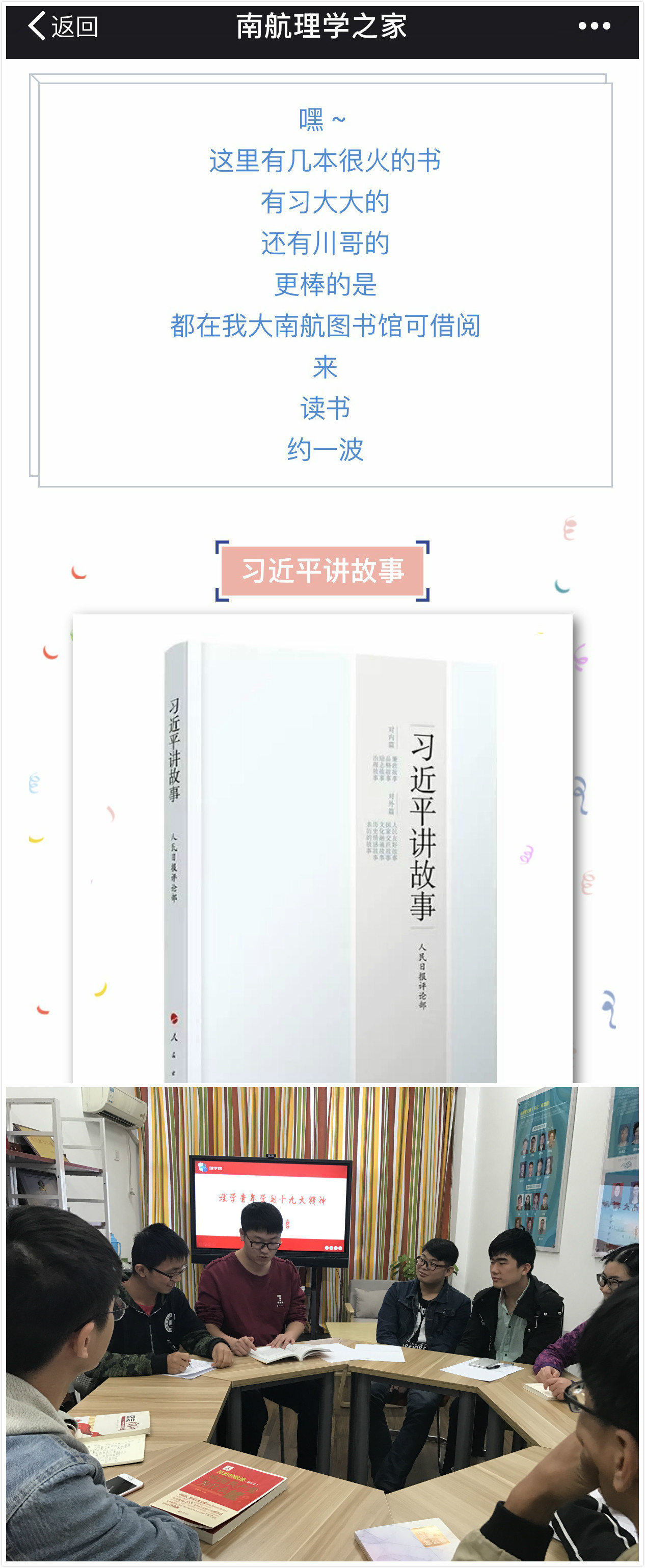 为发挥青年主体作用,更好的学习宣传贯彻党的十九大精神,学院团委面向青年学生推出“红色书单”,推荐了我校图书馆馆藏书籍《习近平讲故事》《习近平用典》《之江新语》《顶天立地谈信仰:原来党课可以这么上》等书籍,倡导学生“爱读书、读好书、善读书”。同时,面向团员举办“不忘初心”读书分享沙龙,尊重青年学生的主体地位,鼓励他们主动分享,唱主角、当主力,调动青年参与和融入学习宣传贯彻党的十九大精神的队伍中。