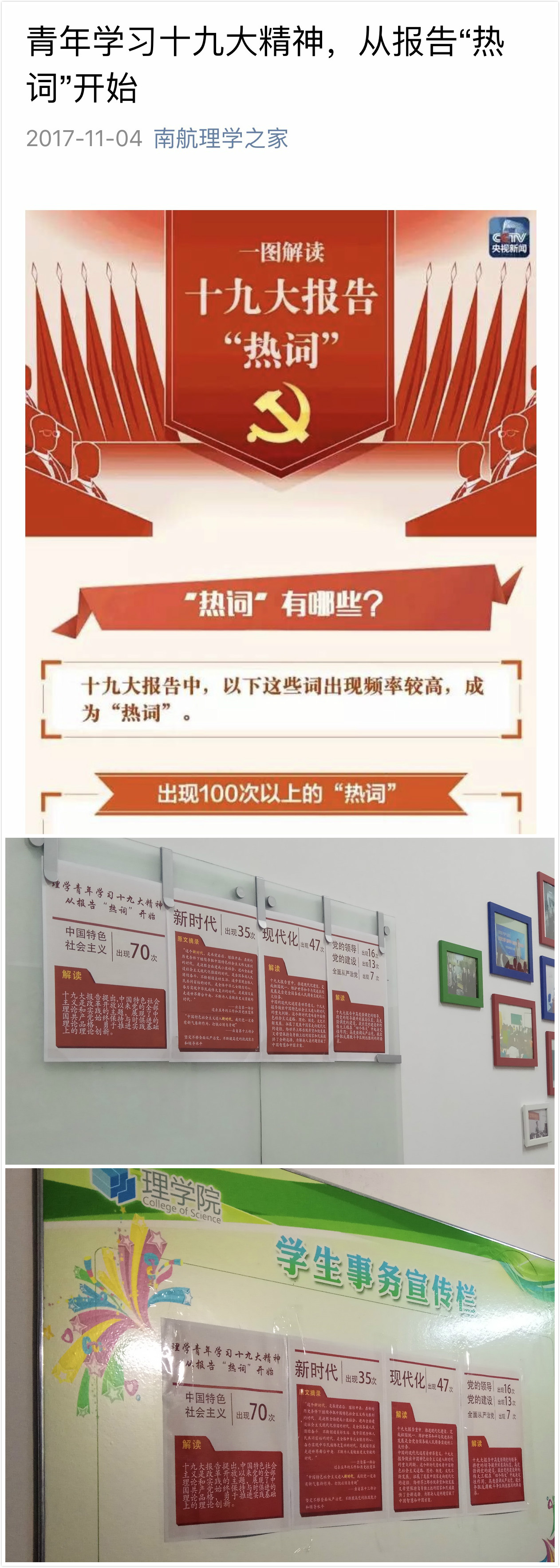 十九大报告中,许多重要的关键词被反复提及。“新时代”一词首次出现在报告中,出现频率达“35”次。此外,“中国特色社会主义”“现代化”“党的领导”等词也在报告中占据了重要的位置。青年在哪里,十九大精神的学习宣传就到哪里,为了让十九大报告内容快速进入青年学生视野,同时帮助青年学生由浅入深的学习理解十九大报告,理学院团委将十九大报告中的“热词”及其含义进行了归纳梳理,并制作成精美图片,张贴在学生宿舍、集中晚自习教室,同时通过学院网络平台发布,让十九大报告内容在青年的学习生活中触手可及。