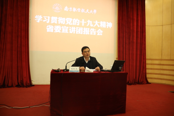 刘松汉以“新时代、新思想、新征程”的主题,围绕“新时代立足新起点,新时代孕育新思想,新时代面对新矛盾,新时代开启新征程,新时代要有新作为”等五个方面,对十九大精神进行了系统阐释和深入解读,全面阐释了中国特色社会主义进入新时代的基本依据和丰富内涵、习近平新时代中国特色社会主义思想核心要义、我国社会矛盾发生的历史性变化、中国特色社会主义发展的战略安排以及新时代党的建设总要求等内容,高度肯定了我校对江苏和国家发展做出的贡献,对南航青年学子提出了期望。报告主题鲜明,思路清晰,内容丰富,重点突出,数据详实,具有很强的理论性和针对性。