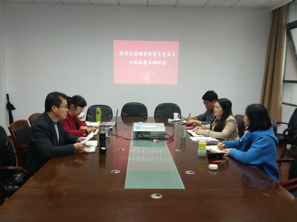 为了进一步加强十九大精神的学习,贯彻落实校学工系统学习党的十九大专题研讨会的会议精神,11月17日,经管学院学生党总支委员会组织召开了十九大专题学习研讨会。经管学院党委副书记、学生党总支书记涂志宏,学生党总支委员庞依达、袁颖、田苑娜出席了会议,辅导员刘小杨、朱一豪列席参加。会议就党的十九大会议精神开展了进一步学习并就“新阶段学生党建工作如何开展”和“学生工作新思路新方法”等两个议题进行了专题研讨。