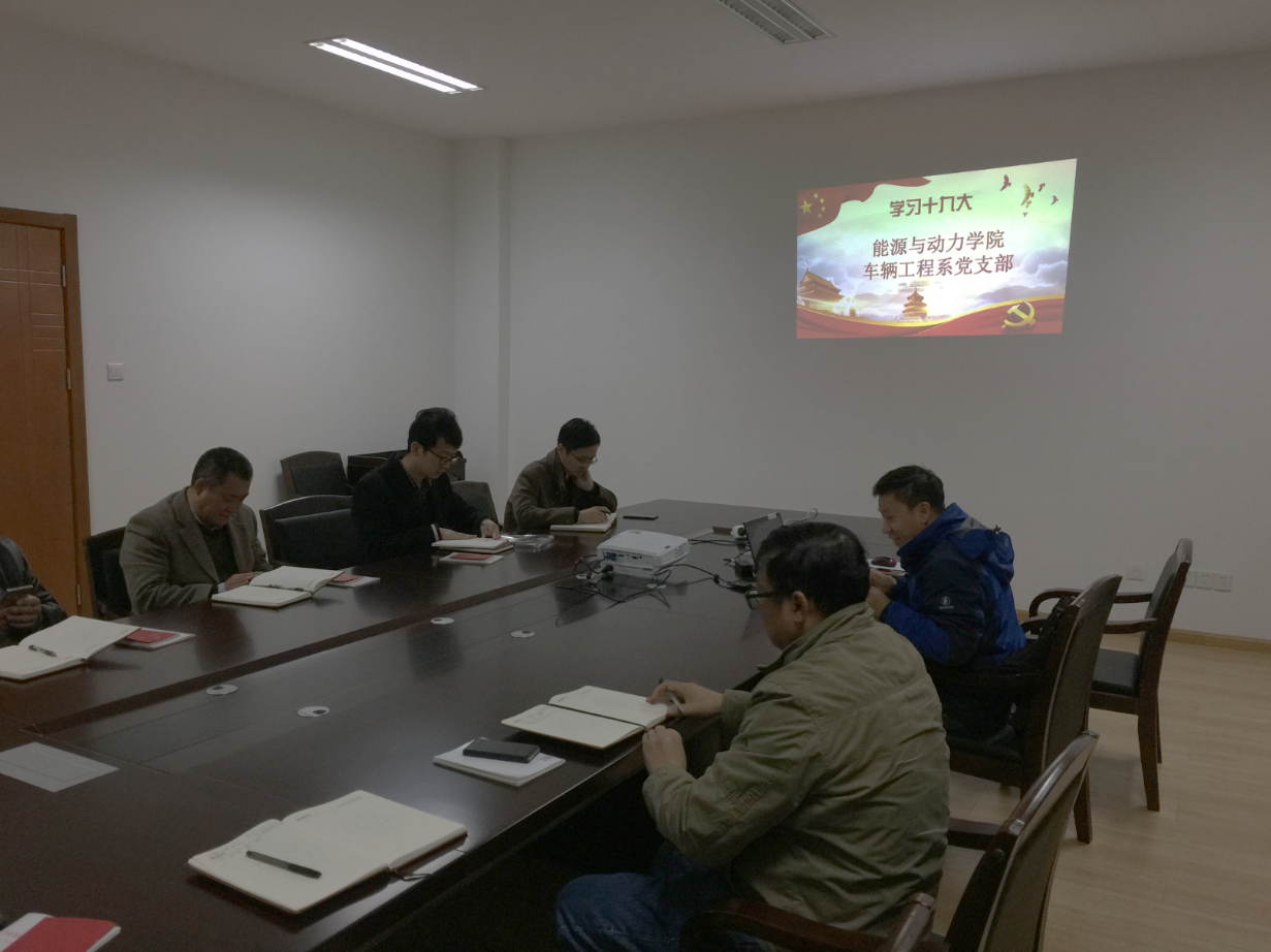 10月20日,能源与动力学院车辆工程系党支部在10号楼600会议室召开支部党员会议,集体深入学习党的十九大精神。会议由支部书记金智林同志主持,全体教工党员参加会议。