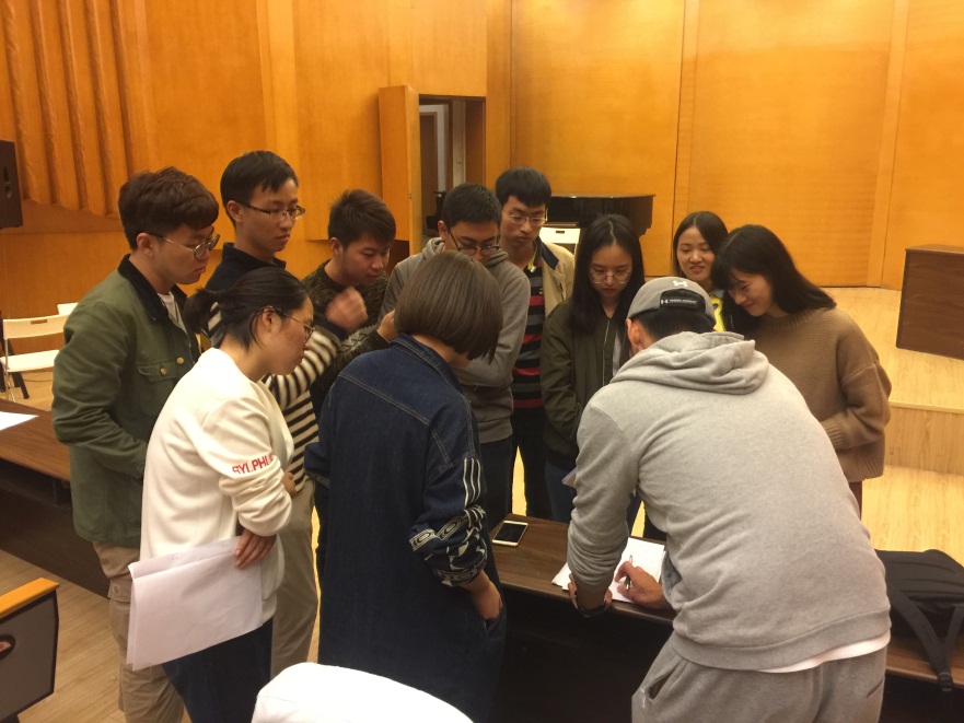 为了保证研究生音乐情景剧的演出质量,艺术学院特地为本次研究生音乐情景剧成立了舞美灯光组、视频制作组、舞台化妆组,分别由学院相关专业的学生组成;同时,为每个剧目都配备两名以上音乐表演专业的学生作为指导老师,从剧本的编写,到演员的筛选;从每一幕的设计,到背景图片的搭配;从表演技巧的演练到整体布局安排,每一个环节,学生指导们都从专业的角度全程指导,既让音乐表演专业的学生可以将自己在台词、编剧、舞美等课程中的所学应用于实践,提升专业技能,也可以让每一个剧目都能在舞台上有一个专业且完美的呈现。每位学生指导都竭尽所能,排练时常直至深夜,陪伴着演员们塑造出每一个生动的角色,演绎着每一场激情澎湃的情景。学生指导们陪着演员一起哭、一起笑,不仅建立了深厚的友谊,也让理工科专业的研究生理解了艺术表演形式,也在潜移默化中享受了艺术的独特魅力。
