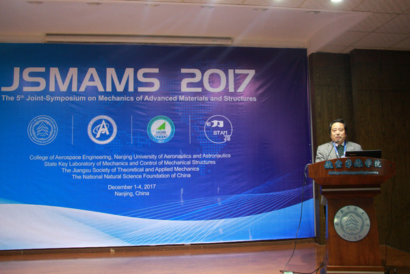2017年12月1-4日,由南京航空航天大学和江苏省力学学会联合举办的“第五届先进材料与结构的力学中日双边学术研讨会”(The 5th Joint-Symposium on Mechanics of Advanced Materials and Structures)在南京召开,本次大会由南京航空航天大学钱征华教授担任大会主席,会议得到了机械结构力学及控制国家重点实验室、南京航空航天大学航空宇航学院、中国力学学会和国家自然科学基金委的积极支持。近60名代表参加了本次研讨会,其中日本有来自东京工业大学、东北大学、静冈大学、中央大学、东京都市大学、大阪府立大学、神奈川大学等高校的18名代表参会,国内有来自清华大学、哈尔滨工业大学、西安交通大学、大连理工大学、浙江大学、复旦大学、兰州大学、合肥工业大学、河海大学、南京航空航天大学等高校的几十名代表参会。在两天的学术研讨中,中日两国学者就先进材料与结构的力学研究展开了广泛而深入的交流。