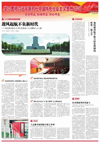 专版以题为《迎风起航不负新时代——南京航空航天大学扎实推进十九大精神入心入脑》的文章,对我校深入学习贯彻习近平新时代中国特色社会主义思想进行了报道;并刊发了校党委书记郑永安的署名文章《加快建设航空航天特色鲜明的世界一流大学》;同时,专版还刊发了中国科学院院士、我校郭万林教授的文章《培养创新型时代新人》以及我校航空宇航学院研究生黄鸣阳的《立志献身祖国航空航天事业》一文。
