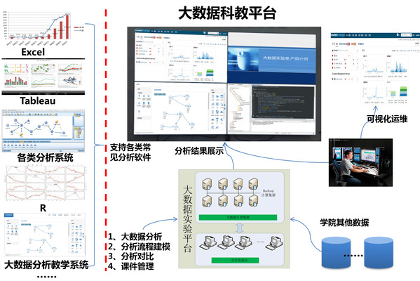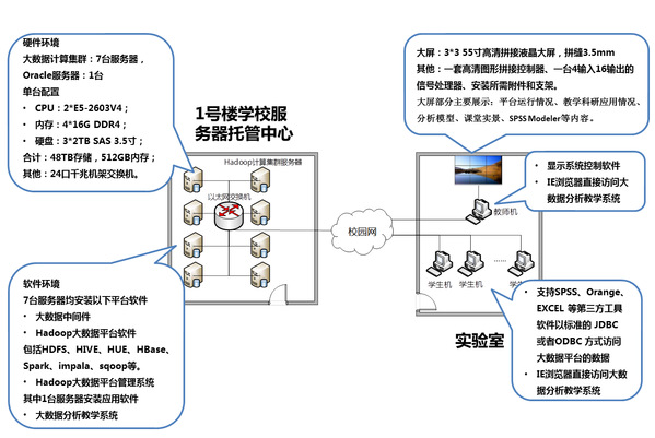 大数据科教平台包括:结果展示和大批量学生用可视化大屏、八台高性能大数据平台服务器(已配置完毕大数据系统和一些相关的专用软件接口基础件,并初步配置了自然语言处理的功能软件)。为大数据相关课程提供了授课、实验环境。