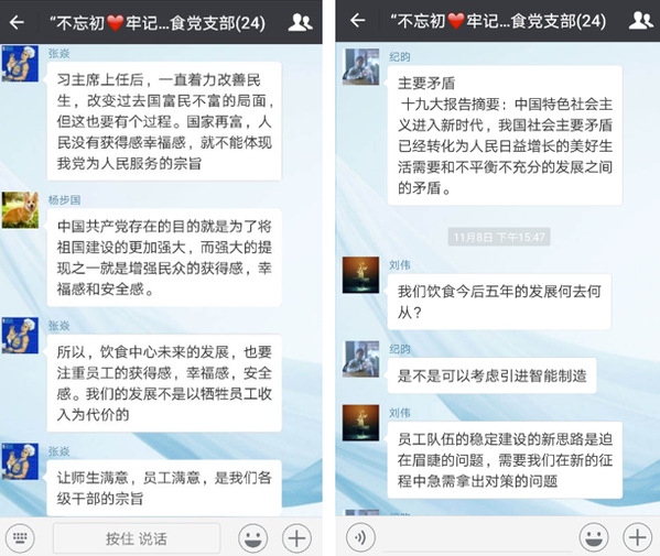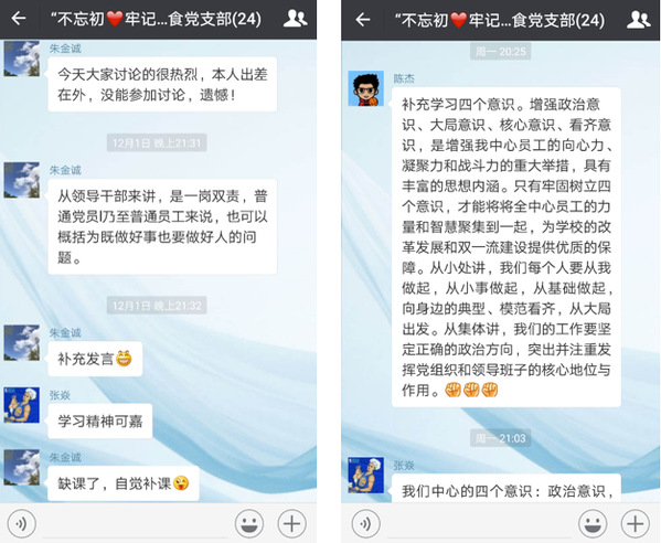 随着全校学习十九大精神的全面展开,基层单位结合工作实际,创新学习方式,取得了良好的学习效果。每天下午三点半,后勤集团饮服中心党支部微信群便像定了闹钟一样准时热闹起来。从集团分管领导到中心主任,再到食堂一线员工,支部党员全员参与30分钟的主题学习。