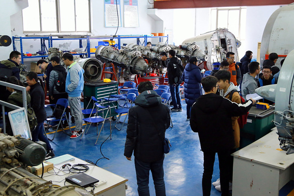 第三站发动机拆装实验室,由民航工程系教师曹愈远担任讲解员,他为大家讲解如涡喷、涡扇、活塞式发动机等不同类型发动机构造,并近距离观察了其内部零件,为学生讲解飞机结构。