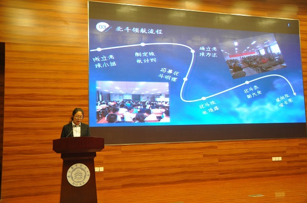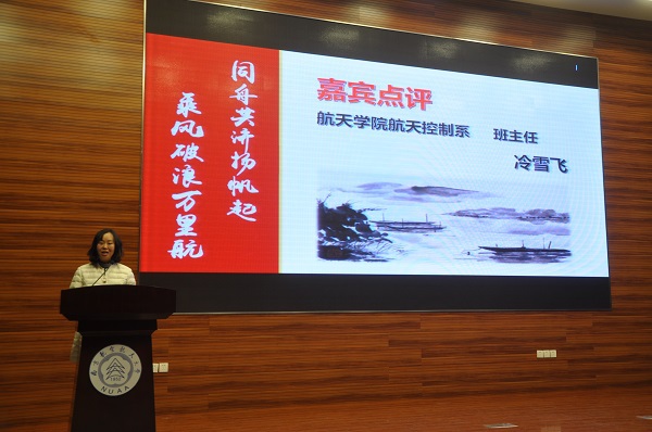 在第二篇章“同舟”环节,优秀的团队奖项获得者上台发表了自己的获奖感悟。他们分别是先进班级1515201班、先进宿舍博9-10102与优秀学风引导团队北斗领航团队。发言同学展示了团队的优秀成绩,并分享了自己的成功经验。航天控制系班主任冷雪飞老师进行了点评。她指出,“同舟”对于同学们而言就是“团结,互助,共同进步”的团队文化。优秀的宿舍文化,能带动优秀的班级文化,而朋辈之间的互助精神形成传承,让一届又一届的航天学子在集体中不断前行。