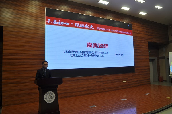 12月21日,航天学院在将军路校区一号楼四楼报告厅举行“不忘初心,砥砺航天”2016-2017学年总结表彰大会。学院院长陈卫东、副院长王海涛、院党委副书记庞小燕,北京罗麦科技有限公司运营总监、启明公益基金会副秘书长杨庆明,北京罗麦科技有限公司江苏分公司经理、启明公益基金会江苏项目部部长吴剑,启明公益基金会宣传部部长朱琳,中科新松有限公司营销总监张标、人力资源部部长于靓、南京分公司副主任王平,学院本科生导师、班主任、辅导员,本科生和研究生代表参加了此次总结表彰大会。