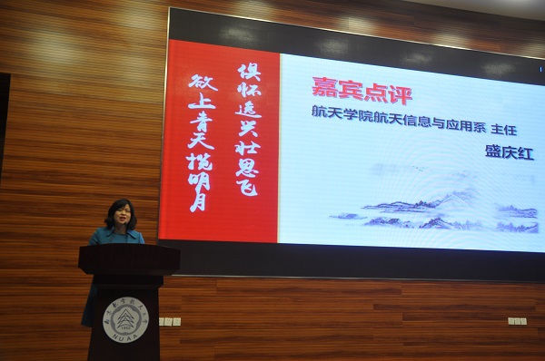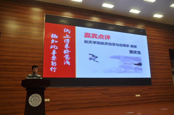 在第三篇章“砥砺”环节,微小卫星创新团队以专注实践为中心展示了他们的科创经历。研究生国奖获得者牛康同学、公派出国博士研究生、新松奖学金获得者江秀强同学分别分享了自己的奋斗经历,并鼓励同学们坚韧不拔,以唯实创新砥砺航天之志。航天信息与应用系教授曾庆生老师在点评中,表达了对在座同学的殷殷期待,勉励航天学子对自己、对学院、对学校充满自信。