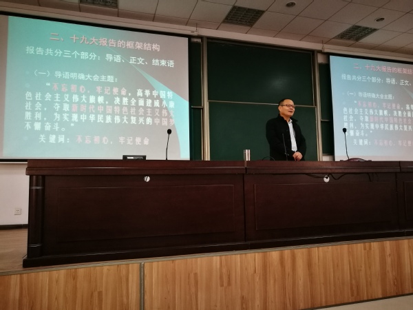 邓伯军教授全面阐述了党的十九大报告的主要精神,重点诠释了中国特色社会主义进入了新时代、关于新时代中国共产党的历史使命、习近平新时代中国特色社会主义思想、关于两个一百年奋斗目标的战略部署、关于我国经济社会发展重大战略部署、坚定不移全面从严治党,不断提高党的执政能力和领导水平六个部分的内容,深入讲解了关于新时代、新使命、新思想、新征程的深刻内涵和深远意义。报告既有理论阐述、又有生动事例,博古通今,深入浅出,赢得了在场师生们的阵阵掌声。