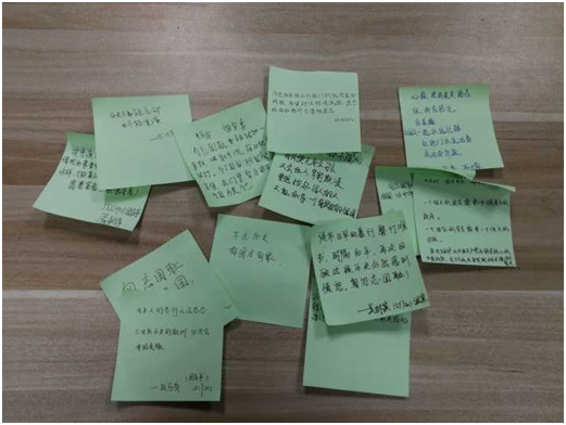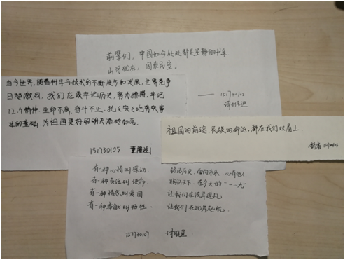 活动由“我想对祖国说的话”拉开序幕,每个人都通过爱国便签表达出自己对国家的真情实感,提高自己的爱国意识,同时也表达自己对国家的祝福与愿望,坚定自己的爱国心,抒发自己的爱国情。之后对于一二·九的切身感受进行了交流和讨论,更进一步激起青年一代航天人的爱国情怀。
