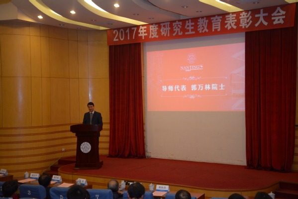 会上,研究生导师代表、力学学科全国优博指导教师、中国科学院院士郭万林教授作了发言,他分享了自己指导研究生和治学的方法,希望导师在教学中要不断学习充电、更新知识,研究要有前瞻性,希望广大研究生珍惜时间、让每一分钟都有价值,不断超越。