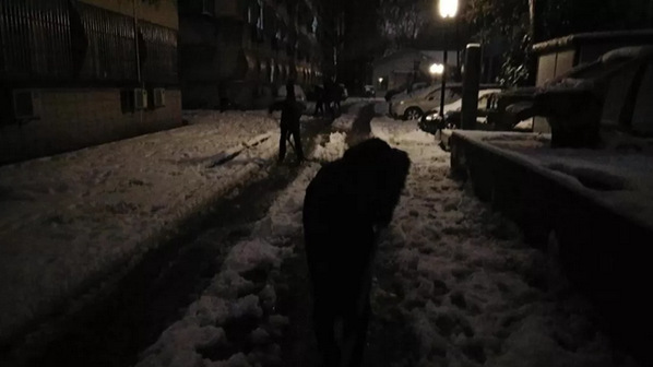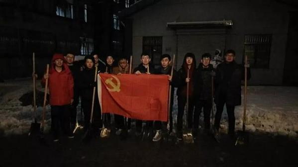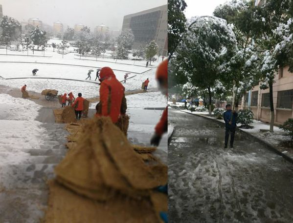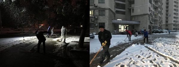 后勤工作人员从凌晨开始清扫校园主干道和宿舍楼下积雪