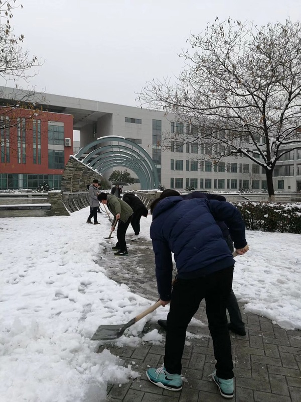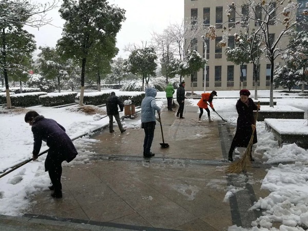 为保证师生安全,后勤工作人员启动冰冻应急预案和扫雪铲冰应急预案,提前对校内水电设施进行巡检保修,防止寒冷环境下设备损坏。后勤各部门就及时启动,人员到岗就位,扛着铁锨、竹竿、扫把、木铲等工具,进行除雪清理工作。从1月4日凌晨开始,工作人员及时清理宿舍、教学楼周围和家属区积雪,并将防滑草垫铺放在宿舍楼栋、食堂、教学区楼栋的入口处,并积极对主干道进行排查,发现险情立刻排除;同时,采取相关措施,保障食堂和班车的正常运行。