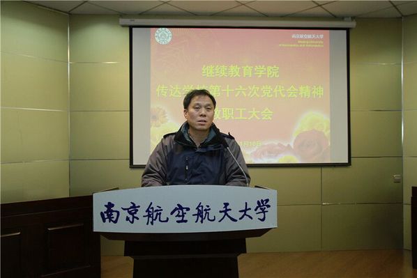 1月10日下午,继续教育学院在12号楼报告厅召开全体教工大会,学习贯彻中共南京航空航天大学第十六次党代会精神。会议由学院院长杜传锋主持,学院党委书记聂东林传达校十六次党代会精神。