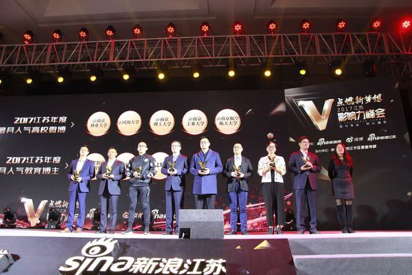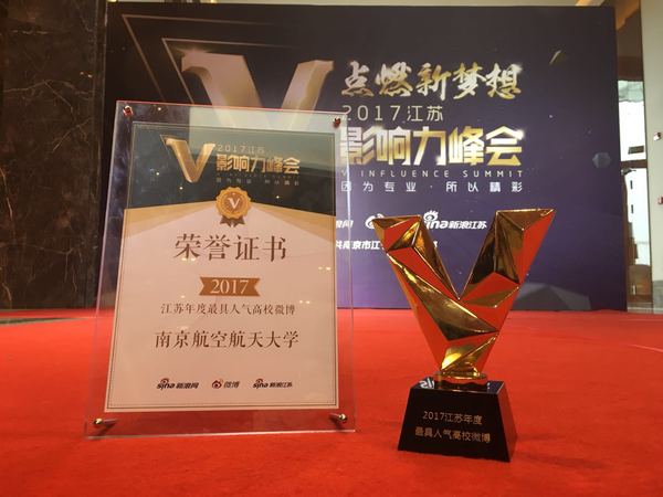 作为江苏省年终最重要的网络文化活动之一,“2017江苏V影响力峰会“以“点燃新梦想”为主题,集中展示了江苏新媒体、政务微博取得的优异成绩,颁发了2017年度江苏“最具影响力”及“最具人气”系列微博奖项。其中,南京航空航天大学、南京理工大学、南京工业大学、南京林业大学、河海大学等在宁五所高校的官方微博获得“2017江苏年度最具人气高校微博”称号。