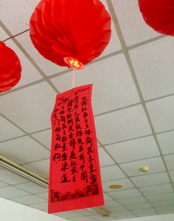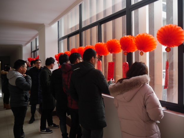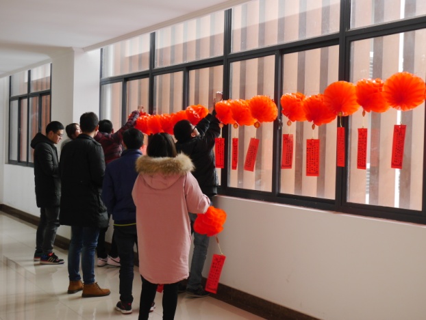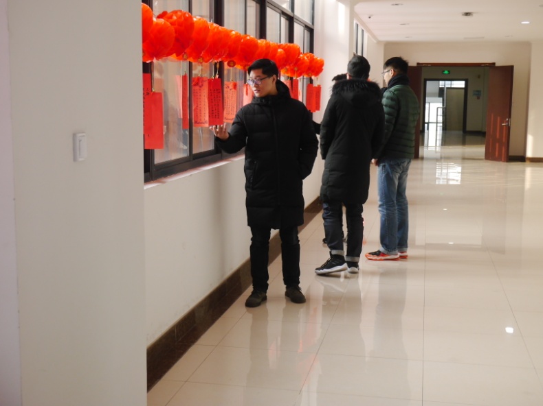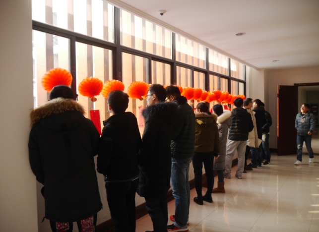 写完寄语后,党支书们又将祝福寄语挂在大红灯笼下,把大红灯笼穿成排挂在学院三楼的走廊里。窗外白雪皑皑,窗内一片火红,在这寒冷的严冬里,党支书们让学习十九大的氛围更加浓厚热烈。