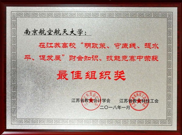 为深入学习贯彻党的十九大精神,进一步宣传财务政策,促进全省高校财会队伍建设,2017年11月至2018年1月,江苏省教育厅、江苏省财政厅主办,江苏省教育会计学会和江苏省教育科技工会承办,在全省高校范围内开展了“明政策、守底线、提水平、促发展”财会知识、技能竞赛。