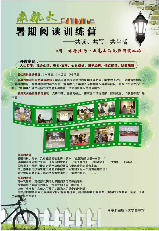建设网上阅读交流平台,贴近大学生的行为空间。线上线下形式多样的阅读推广活动,通过馆内展示、图书馆的主页“我爱阅读”专栏、图书馆官方微博、微信平台,以及读书会微信、教师、学生微信群、QQ群的传播,以新媒体形式及时发布,跟踪宣传。学生在哪里、我们的信息发布在哪里,增加活动的吸引力、粘合力。来吧,来图书馆浸泡时光,让自己的青春留下更多值得回味的文化印记。更多书香范儿、更多思考力。