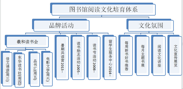 每学期举办阅读类讲座:“打开心灵之门——大学生阅读与身心灵成长”、“青春好读书:数字阅读环境下纸质图书收藏及选择技巧”、“用“国学”读懂大学的“美”、“当阅读遇见思维导图”、“当阅读遇见美”、“你的心事,书来解——认识阅读疗法”;组织举办、联合吸引各类专题文化类宣传展览,学生艺术作品、设计作品展览,营造文化氛围。