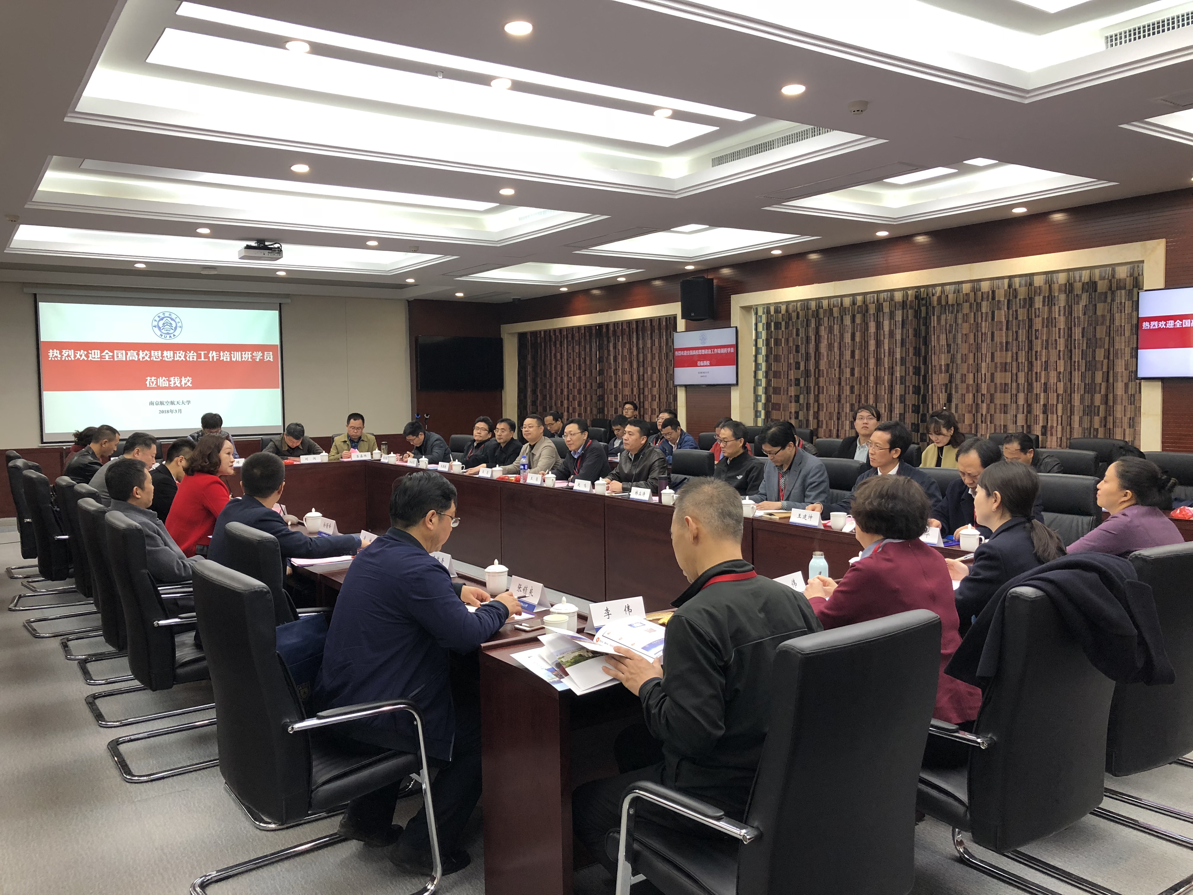 3月22日下午,全国高校思想政治工作培训班现场教学环节在我校开展。来自全国各高校学工部、研工部负责同志一行48人来我校调研。校党委常委、宣传部部长王晖,马克思主义学院党总支书记徐川,学生处副处长徐曙峰参加了座谈。