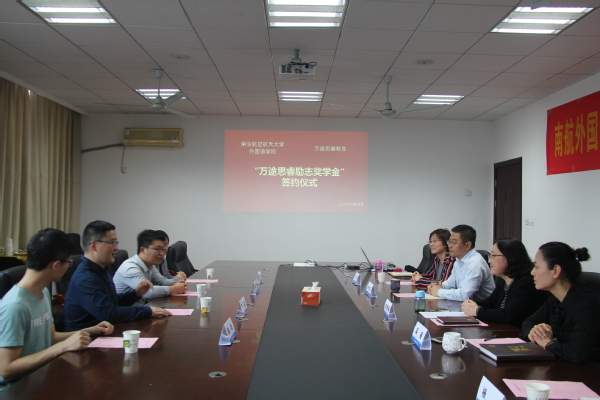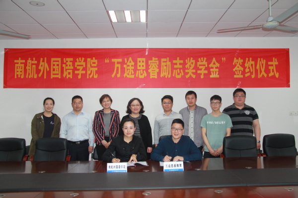 4月3日下午,外国语学院“万途思睿励志奖学金”签约仪式在学院322会议室举行。南航校友、外国语学院06届毕业生、万途思睿教育校长丁亮,万途思睿教育分校负责人杜敏、陈功、徐正,外国语学院党委书记刘健荣、副院长刘长江、院党委副书记梁薇、校学生处资助管理中心主任雷蕾、外国语学院团委书记杨一、本科生辅导员彭欢、本科生兼职辅导员张秋逸参加了此次签约仪式。
