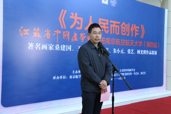 4月8日上午,“《为人民而创作》江苏省中国画学会走进南京航空航天大学(第四站)——著名画家桑建国、王野翔、王立庆、朱小元、张艺、顾光明作品联展”在我校明故宫校区大学生活动中心开幕。校党委常委、纪委书记杭育新,校党委常委、党委宣传部部长王晖,中国画学会副会长、江苏省中国画学会会长高云,江苏省中国画学会副会长兼秘书长、南京图书馆党委书记韩显红,江苏省中国画学会副会长、江苏省文化厅原副巡视员嵇亚林,南京市文广新局巡视员顾小荣,南京书画院院长,民盟江苏省委副主委、江苏省书法家协会副主席刘灿铭,以及我校相关部处领导和部分学院师生代表等出席开幕式。开幕式由校党委宣传部副部长孔令华主持。