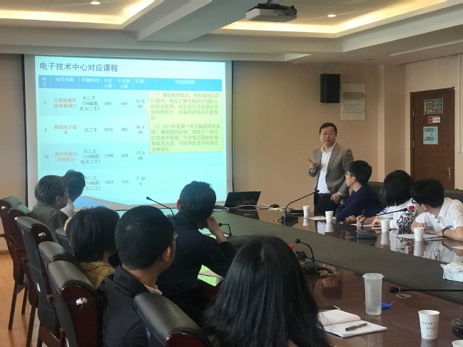 随后,电子技术中心教学副主任陆熊老师,重点剖析了近年来工程教育背景下的课程改革对教师课堂教学及学生学习效果等方面的影响,并提出了加强平时考核,增加与工程案例相关的知识讲解和例题分析等几项措施。