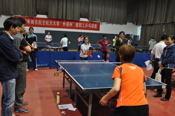 “外语杯”乒乓球赛是南航教职工文体活动的一项品牌活动,本次比赛由外国语学院首次承办,在校工会的支持和指导下,在体育部老师的大力协助下,报名抽签、场地安排、秩序册制定、赛事宣传等前期工作都有条不紊地进行着。各院级工会都对此次赛事予以高度重视和大力支持,精心选拔队员、组织训练、策划布局、安排补给和啦啦队。对于平日里肩负教学、科研及管理重任的教职工来说,乒乓球赛为他们提供了提高球技、强身健体的机会,更重要的是营造了积极进取、团结拼搏的比赛氛围,为教职工相互交流、增进友谊搭建了良好平台。学校机关的许多领导、教学科研一线的教授们都积极参与了该项活动。校领导十分重视、关心教职工文体活动的开展,党委书记郑永安亲自来到决赛现场为队员们鼓劲加油。