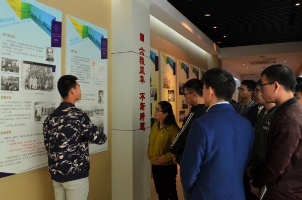 活动伊始,两个支部党员一同参观了南京航空航天大学校史馆。在讲解员的带领下,党员们回顾了南航66年的发展历史,专业的飞机模型、灿烂的荣誉奖章、金工实习用具等一些充满历史印记的场景吸引了大家的兴趣,党员们积极地和讲解员进行交流,认真聆听历史背后的故事。