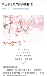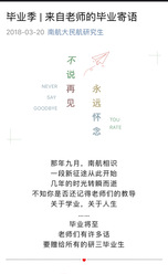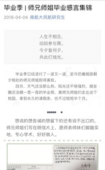 研究生三年的学习生涯中,每一步前行都离不开老师的引领与指导,每一份师生情都是最值得珍藏的记忆。毕业季,学院以师生情为主题开展了“毕业联播”系列活动,活动涵盖“来自老师的毕业寄语”、“毕业感言集锦”、“毕业祝福墙”三个子活动,通过语言文字、视频,记录毕业生们在民航学院三年研途生活的点滴过往。“来自老师的毕业寄语”活动,邀请各专业老师对即将毕业的2018届研究生们书写毕业寄语,劝勉毕业生在未来的人生道路上不畏失败、敢于拼搏。“毕业感言集锦”活动,通过手写明信片的形式,记录每一位毕业生三年民航生活的研途感悟和对南航校园生活的不舍,表达毕业生们与民航师生三年朝夕相伴的师生情,民航情;“毕业祝福墙”活动,邀请研一、研二的同学们将心中想对毕业师兄师姐说的话录制成视频,分享与师兄师姐朝夕相处的感动,送上最暖的祝福,并将视频拼接成一面“毕业祝福墙”,为即将离别南航生活的毕业生们送上最真挚的祝福。
