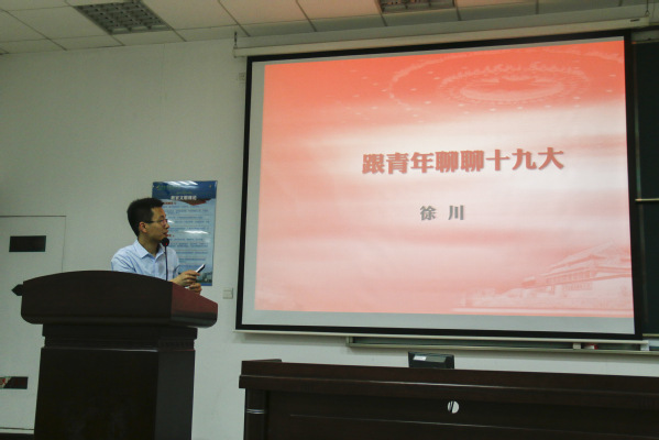 讲座中,徐川老师从七种角度对十九大进行了阐释。第一个角度是历史中的党代会。徐老师通过追溯历史上的党代会,结合党的一大年仅19岁的代表刘仁静是如何选出的、党的二大毛泽东是否参加之谜等小故事,讲述了中国共产党艰苦卓绝的发展历程。