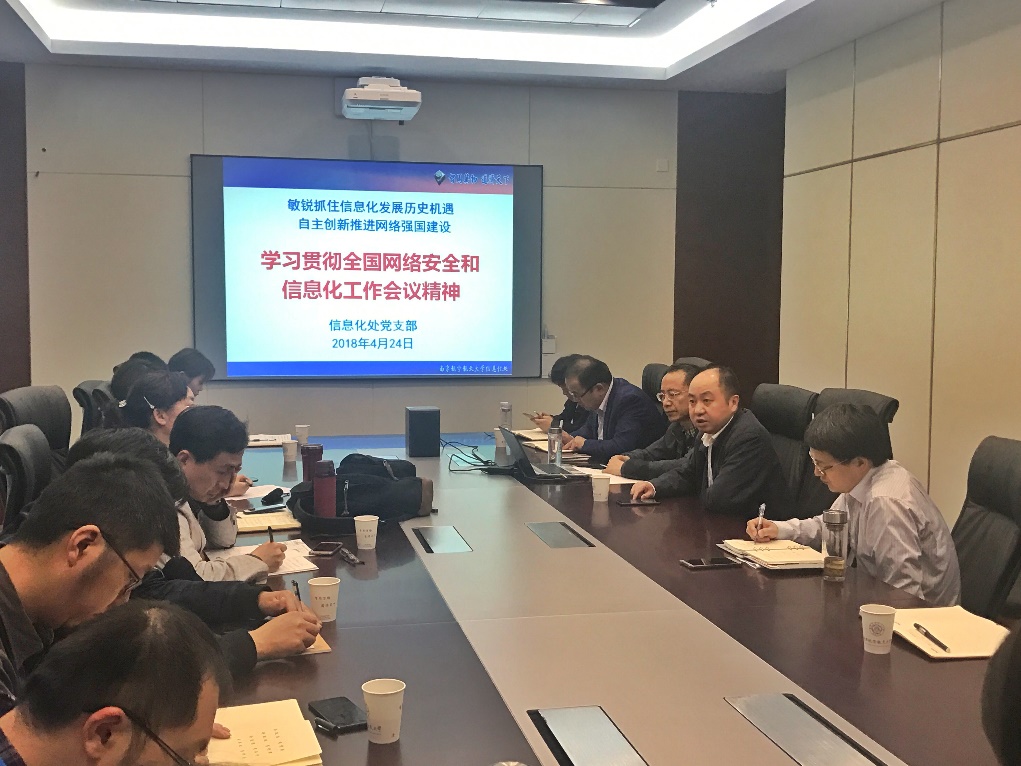 4月24日下午,信息化处党支部召开党员大会,传达和学习全国网络安全和信息化工作会议精神,会议由信息化处支部副书记石景山主持。
