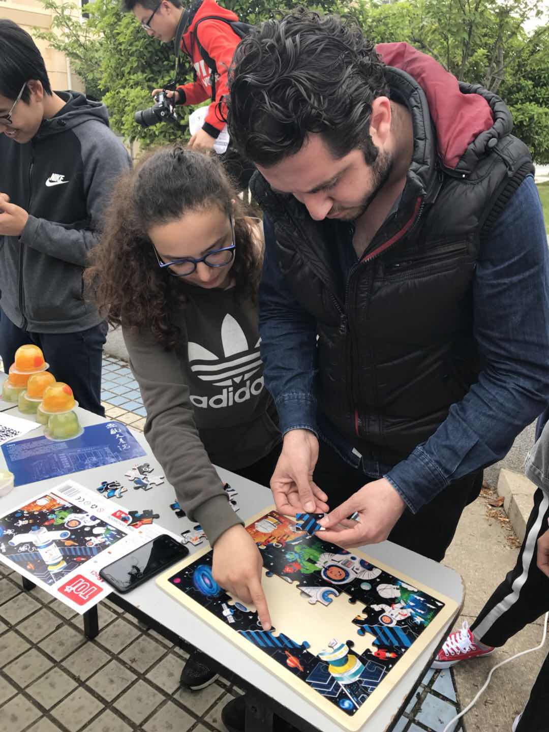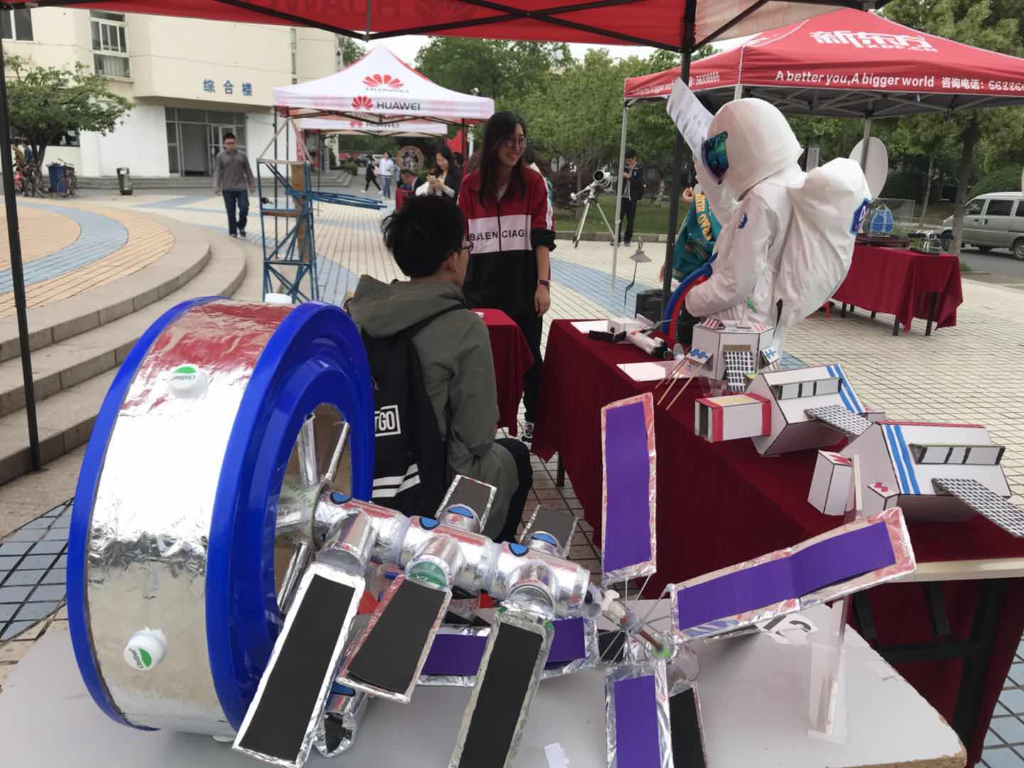 “航天嘉年华”现场,各类航天主题互动展位丰富多彩,为师生们准备了“虚拟现实技术体验、航天真人跳一跳、航天拼图、航天知识竞答、太空观测活动、DIY模型展示”等活动。与此同时,爱好航天的同学身着航天服,体验航天员的自豪与荣耀。