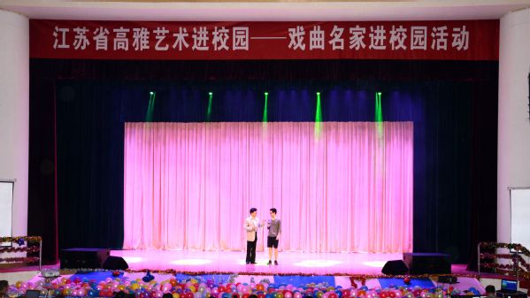 主持人徐兆佩首先来到台前,他说能让中国传统文化戏曲艺术走进校园,实现和老师同学们的零距离的接触让他感到非常的激动和欣慰。戏曲文化凝聚着中国传统文化的美学思想精髓,而且今天来演出的都是江苏省国宝级的艺术家。戏曲文化走进校园,一方面促进了中国传统文化的保护和传承,另一方面也让大家拥有一个更好地亲近艺术、聆听大师、提升艺术素养、感受艺术魅力的平台。